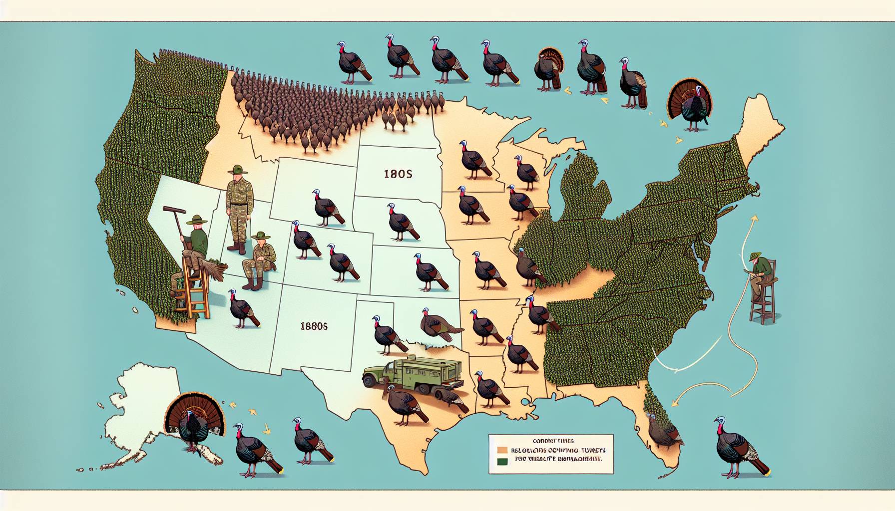 Earlyrestorationeffortsinthe1940sand50sfocusedonraisingturkeysonfarms, butlatereffortssawsuccesswhencapturingwildturkeysandrelocatingthem.